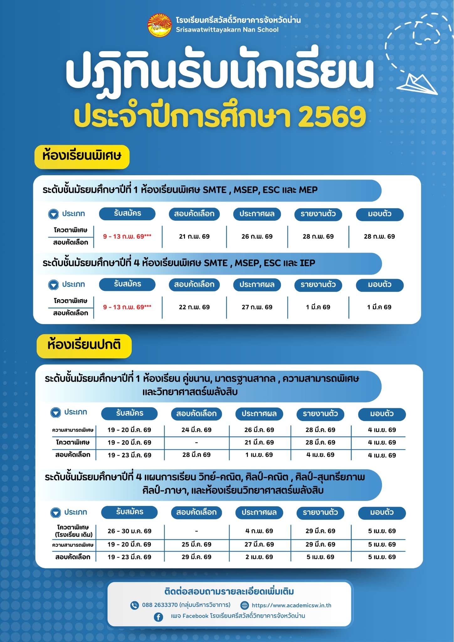 ประกาศปรับเปลี่ยนวันรับสมัครสอบคัดเลือก ห้องเรียนพิเศษ 2569 / Update, ประชาสัมพันธ์ / By Admin Post Views: 114