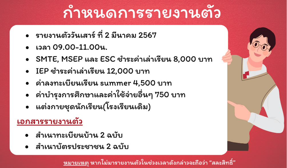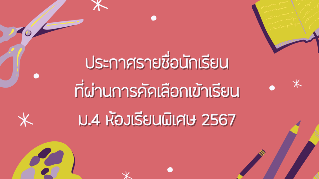 ประกาศรายชื่อนักเรียนที่ผ่านการคัดเลือกเข้าเรียน ม.4 ห้องเรียนพิเศษ ปีการศึกษา 2567 / ประชาสัมพันธ์ / By Admin Post Views: 474 📣 ประกาศผลการคัดเลือก ม.4 ห้องเรียนพิเศษ 2567 🙋♂️ รายชื่อนักเรียน ม.4 ห้องเรียนพิเศษ 2567 📜 รายชื่อนักเรียนตัวสำรอง ม.4 ห้องเรียนพิเศษ 2567